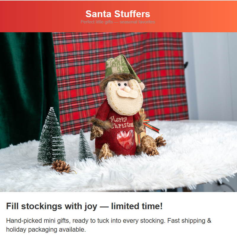 <!DOCTYPE HTML PUBLIC "-//W3C//DTD XHTML 1.0 Transitional //EN" "http://wwww3.org/TR/xhtml1/DTD/xhtml1-transitional.dtd"> <html xmlns="http://www.w3.org/1999/xhtml" xmlns:v="urn:schemas-microsoft-com:vml" xmlns:o="urn:schemas-microsoft-com:office:office"> <head> <!--[if gte mso 9]> <xml> <o:OfficeDocumentSettings> <o:AllowPNG/> <o:PixelsPerInch>96</o:PixelsPerInch> </o:OfficeDocumentSettings> </xml> <![endif]--> <meta http-equiv="Content-Type" content="text/html; charset=UTF-8"> <meta name="viewport" content="width=device-width, initial-scale=1.0"> <meta name="x-apple-disable-message-reformatting"> <!--[if !mso]><!--><meta http-equiv="X-UA-Compatible" content="IE=edge"><!--<![endif]--> <style type="text/css"> @media only screen and (min-width: 520px) { .u-row { width: 500px !important; } .u-row .u-col { vertical-align: top; } .u-row .u-col-100 { width: 500px !important; } } @media only screen and (max-width: 520px) { .u-row-container { max-width: 100% !important; padding-left: 0px !important; padding-right: 0px !important; } .u-row { width: 100% !important; } .u-row .u-col { display: block !important; width: 100% !important; min-width: 320px !important; max-width: 100% !important; } .u-row .u-col > div { margin: 0 auto; } } body{margin:0;padding:0}table,td,tr{border-collapse:collapse;vertical-align:top}.ie-container table,.mso-container table{table-layout:fixed}*{line-height:inherit}a[x-apple-data-detectors=true]{color:inherit!important;text-decoration:none!important} table, td { color: #000000; } #u_content_paragraph_1 a { color: #000000; } #u_content_paragraph_4 a { color: #838080; } </style> </head> <body class="clean-body u_body" style="margin: 0;padding: 0;-webkit-text-size-adjust: 100%;background-color: #ffffff;color: #000000"> <!--[if IE]><div class="ie-container"><![endif]--> <!--[if mso]><div class="mso-container"><![endif]--> <table role="presentation" id="u_body" style="border-collapse: collapse;table-layout: fixed;border-spacing: 0;mso-table-lspace: 0pt;mso-table-rspace: 0pt;vertical-align: top;min-width: 320px;Margin: 0 auto;background-color: #ffffff;width:100%" cellpadding="0" cellspacing="0"> <tbody> <tr style="vertical-align: top"> <td style="word-break: break-word;border-collapse: collapse !important;vertical-align: top"> <!--[if (mso)|(IE)]><table role="presentation" width="100%" cellpadding="0" cellspacing="0" border="0"><tr><td align="center" style="background-color: #ffffff;"><![endif]--> <div class="u-row-container" style="padding: 0px;background-color: transparent"> <div class="u-row" style="margin: 0 auto;min-width: 320px;max-width: 500px;overflow-wrap: break-word;word-wrap: break-word;word-break: break-word;background-color: transparent;"> <div style="border-collapse: collapse;display: table;width: 100%;height: 100%;background-color: transparent;"> <!--[if (mso)|(IE)]><table role="presentation" width="100%" cellpadding="0" cellspacing="0" border="0"><tr><td style="padding: 0px;background-color: transparent;" align="center"><table role="presentation" cellpadding="0" cellspacing="0" border="0" style="width:500px;"><tr style="background-color: transparent;"><![endif]--> <!--[if (mso)|(IE)]><td align="center" width="500" style="width: 500px;padding: 0px;border-top: 0px solid transparent;border-left: 0px solid transparent;border-right: 0px solid transparent;border-bottom: 0px solid transparent;" valign="top"><![endif]--> <div class="u-col u-col-100" style="max-width: 320px;min-width: 500px;display: table-cell;vertical-align: top;"> <div style="height: 100%;width: 100% !important;"> <!--[if (!mso)&(!IE)]><!--><div style="box-sizing: border-box; height: 100%; padding: 0px;border-top: 0px solid transparent;border-left: 0px solid transparent;border-right: 0px solid transparent;border-bottom: 0px solid transparent;"><!--<![endif]--> <table id="u_content_paragraph_1" style="font-family:arial,helvetica,sans-serif;" role="presentation" cellpadding="0" cellspacing="0" width="100%" border="0"> <tbody> <tr> <td style="overflow-wrap:break-word;word-break:break-word;padding:10px;font-family:arial,helvetica,sans-serif;" align="left"> <div style="font-size: 14px; line-height: 140%; text-align: left; word-wrap: break-word;"> <p style="text-align: center; line-height: inherit; margin: 0px;"><a href="https://mailwebbd.s3.us-east-005.backblazeb2.com/SANTEGDHSGHTESFGDFGD___SGFAGTHEGFDGSG.html"><span style="font-size: 26px; background-color: rgb(243, 10, 10); font-family: Bitter; font-weight: bold;">Tiny gifts, </span><span style="font-size: 26px; background-color: rgb(244, 12, 12); font-family: Bitter; font-weight: bold;">huge smiles shop now</span> <span style="font-size: 26px; background-color: rgb(243, 12, 12); font-family: Bitter; font-weight: bold;">! </span></a></p> </div> </td> </tr> </tbody> </table> <!--[if (!mso)&(!IE)]><!--></div><!--<![endif]--> </div> </div> <!--[if (mso)|(IE)]></td><![endif]--> <!--[if (mso)|(IE)]></tr></table></td></tr></table><![endif]--> </div> </div> </div> <div class="u-row-container" style="padding: 0px;background-color: transparent"> <div class="u-row" style="margin: 0 auto;min-width: 320px;max-width: 500px;overflow-wrap: break-word;word-wrap: break-word;word-break: break-word;background-color: transparent;"> <div style="border-collapse: collapse;display: table;width: 100%;height: 100%;background-color: transparent;"> <!--[if (mso)|(IE)]><table role="presentation" width="100%" cellpadding="0" cellspacing="0" border="0"><tr><td style="padding: 0px;background-color: transparent;" align="center"><table role="presentation" cellpadding="0" cellspacing="0" border="0" style="width:500px;"><tr style="background-color: transparent;"><![endif]--> <!--[if (mso)|(IE)]><td align="center" width="500" style="width: 500px;padding: 0px;border-top: 0px solid transparent;border-left: 0px solid transparent;border-right: 0px solid transparent;border-bottom: 0px solid transparent;border-radius: 0px;-webkit-border-radius: 0px; -moz-border-radius: 0px;" valign="top"><![endi